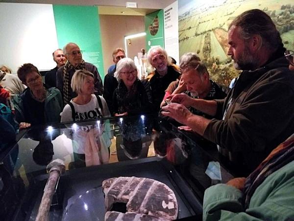 Nun wartet aber ein besonderes Highlight auf uns. Wir besuchen das berühmte Rad aus dem Ljubljansko Barje, dem Laibacher Moor, im städtischen Museum, immerhin eines der ältesten Räder im Alpenraum. Zum Glück haben wir nicht nur die gemeinsam mit dem NHM Wien erstellte Rekonstruktion dieses besonderen Fundes zum Anfassen dabei, sondern sogar den absoluten Fachmann auf dem Gebiet Holz: Wolfgang Lobisser, Experimentalarchäologe. Er liefert an der Vitrine die geballte Ladung Fachwissen, während wir uns das Holzrad, die anderen urgeschichtlichen Funde und die museale Präsentation in Ruhe ansehen können.