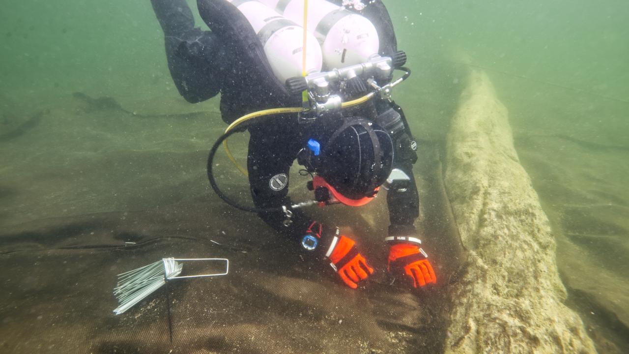 Kuratorium Pfahlbauten - Henrik PohlForschungstaucher beim Verlegen der Basaltschutzmatten