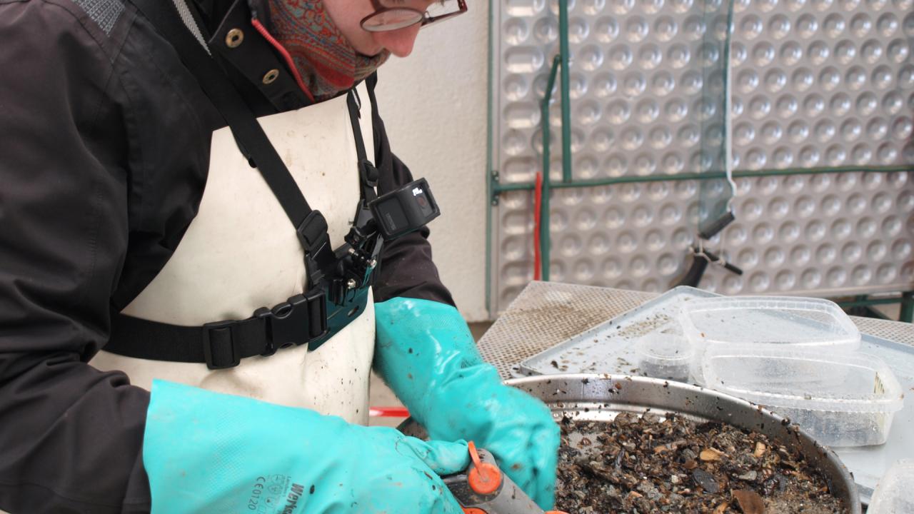 Beim Schlämmen hält man in der einen Hand den Wasserschlauch, um das Material erstmals zu reinigen. Die andere Hand durchsucht sorgfältig mit dünnen Handschuhen das Material nach Artefakten und organischen Überresten. Um ein besseres Feingefühl bei der Suche nach Funden zu bekommen sind hier warme und dicke Wollhandschuhe eher hinderlich.